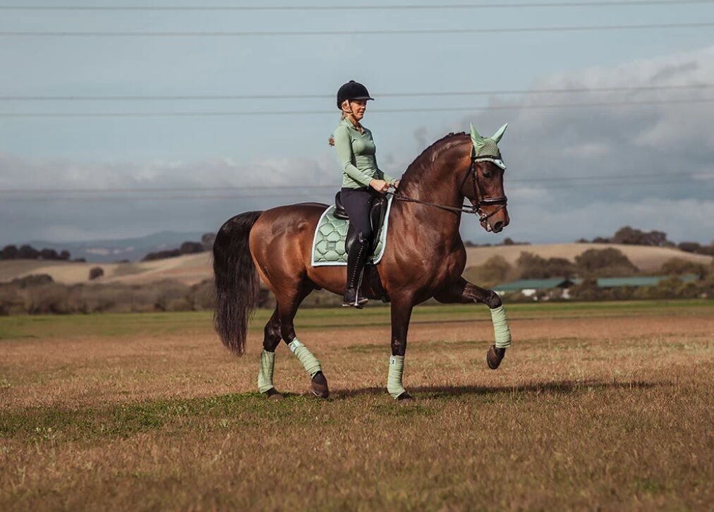 Hoogwaardige fleece bandages in zacht pistache met exclusieve, glanzende details in wit en zilver. Style met het zadeldek uit onze Pistache White-collectie om de elegante look af te maken. Versierd met de stijlvolle ES zilveren badge. Verkocht in sets van vier.