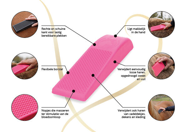 Deze multifunctionele borstel verwijdert eenvoudig losse haren van het paard. Door de nopjes wordt tegelijkertijd de huid gemasseerd.