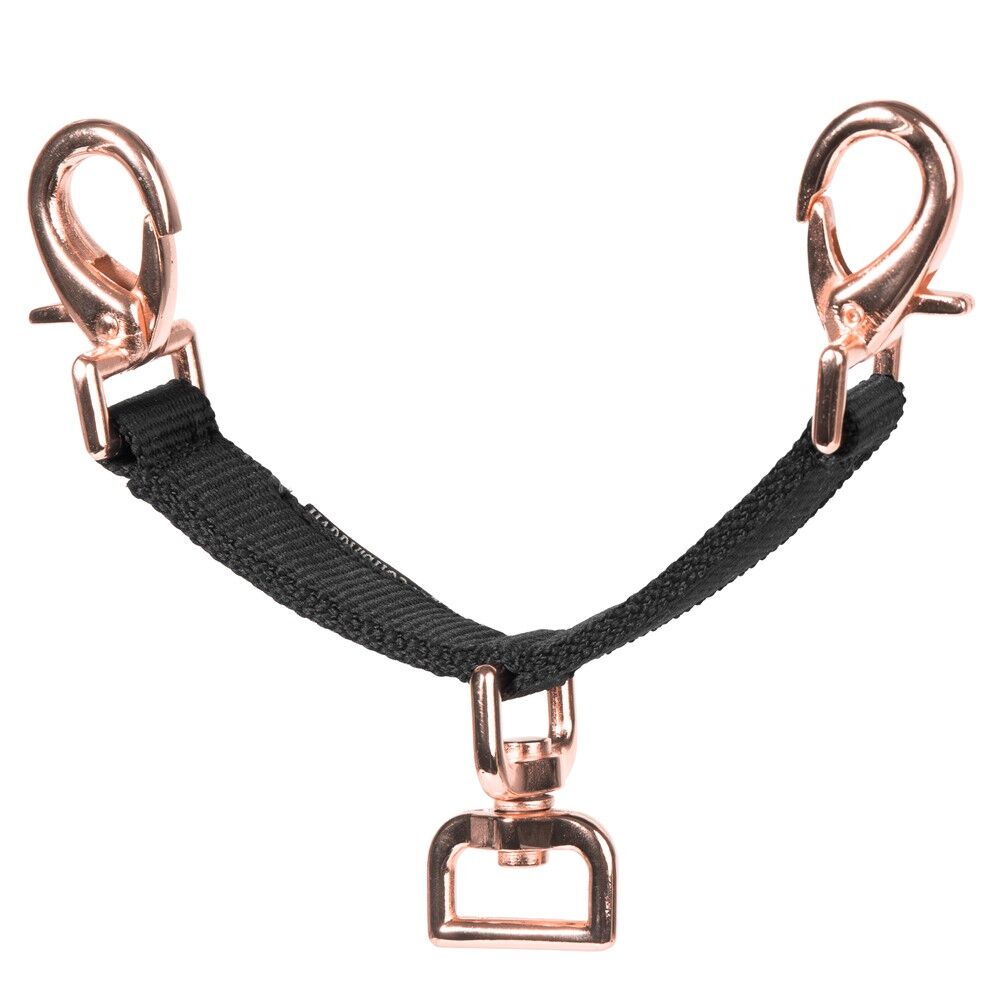 Koppelstuk voor bij het longeren. Bevestiging door middel van musketon aan bit of halster. In het midden een vrijdraaiende ring. Fournituren zijn rosegoud.
