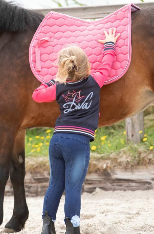 Denim look paardrijlegging met Diva logo's op de voorkant, twee zakken, rondgenaaid zitvlak voorzien van een siliconen print en een elastische inzet rond de enkels.