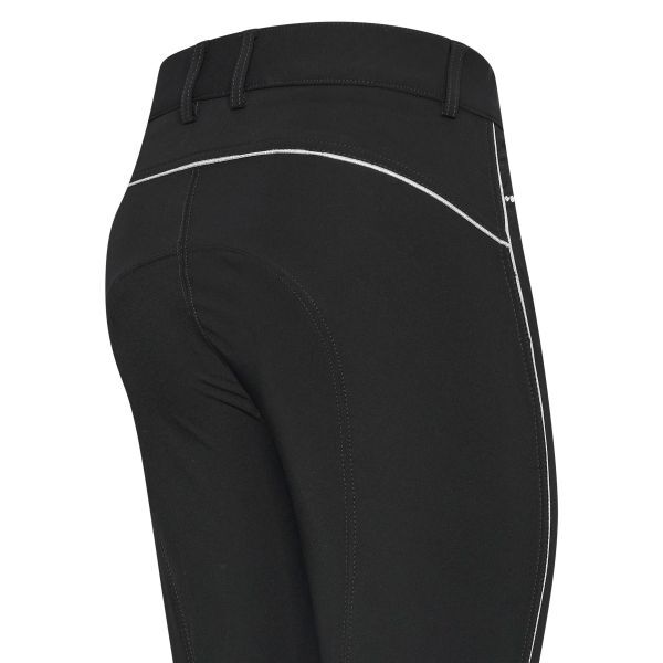 Deze warme rijbroek houdt je warm én geeft je bewegingsvrijheid. Luxe rijbroek met zilveren paspels langs de pijpen en op het passtuk op de achterkant. Met chique steentjes op de voorzakken en een metalen munt op de linker voorzak.