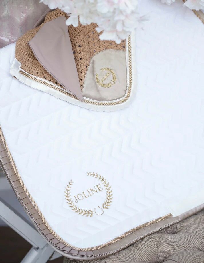 Het zadeldekje wit van Joline is de perfecte keuze voor ruiters die luxe en functionaliteit willen combineren. Dit hoogwaardige velvet zadeldekje straalt elegantie uit dankzij de zachte stof en de verfijnde beige ruches langs de rand. Het exclusieve gouden Joline-logo voegt een vleugje klasse toe, waardoor jouw paard of pony altijd in stijl voor de dag komt.
