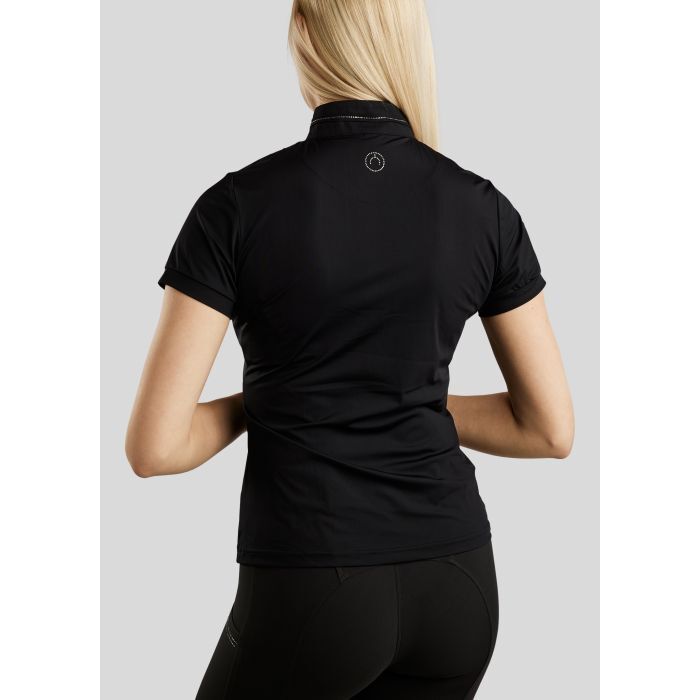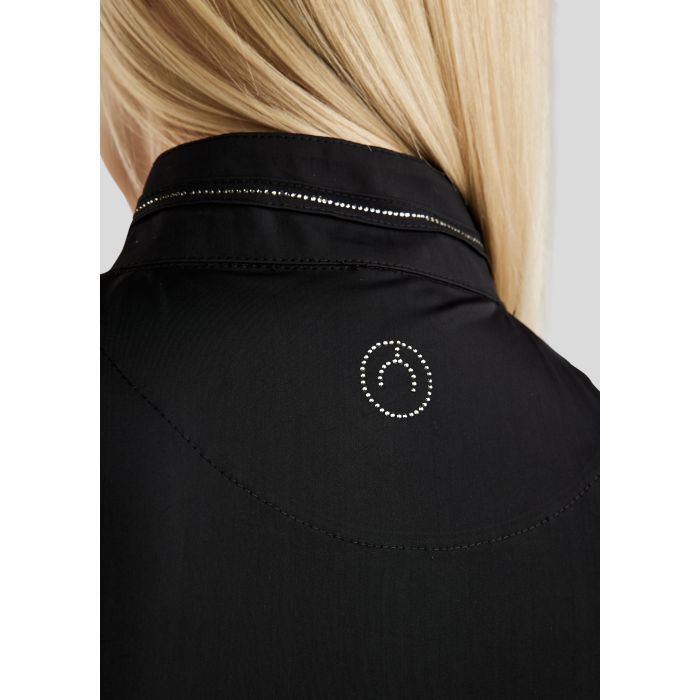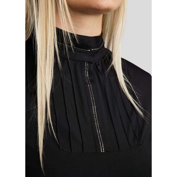 Het MoZitta REFINED Trainingsshirt is voorzien van prachtige pintuck-details bij de halslijn, wat een verfijnde en luxueuze uitstraling geeft. De ritssluiting is afgewerkt met twee rijen sprankelende kristallen, en ook de kraag is gedecoreerd met dezelfde kristallen, wat het shirt een opvallende look geeft. Daarnaast is er een subtiel Montar-logo achter in de nek, gemaakt van dezelfde elegante gunmetal-kristallen.