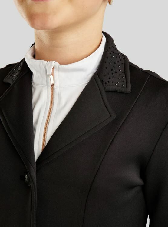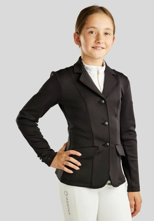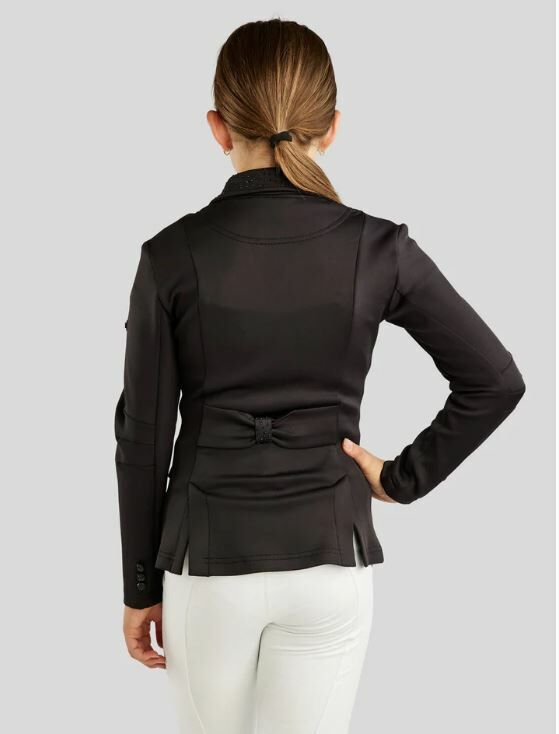 Dit elegante junior wedstrijdjasje in klassiek zwart is speciaal ontworpen voor jonge ruiters die stijl en comfort willen combineren in de ring. Het jasje is voorzien van een verfijnde strikceintuur en subtiele ton-sur-ton kristallen die zorgen voor een chique uitstraling zonder te overdrijven. Gemaakt van ademend, elastisch materiaal dat optimale bewegingsvrijheid biedt tijdens wedstrijden. Een must-have voor iedere ambitieuze ponyruiter!