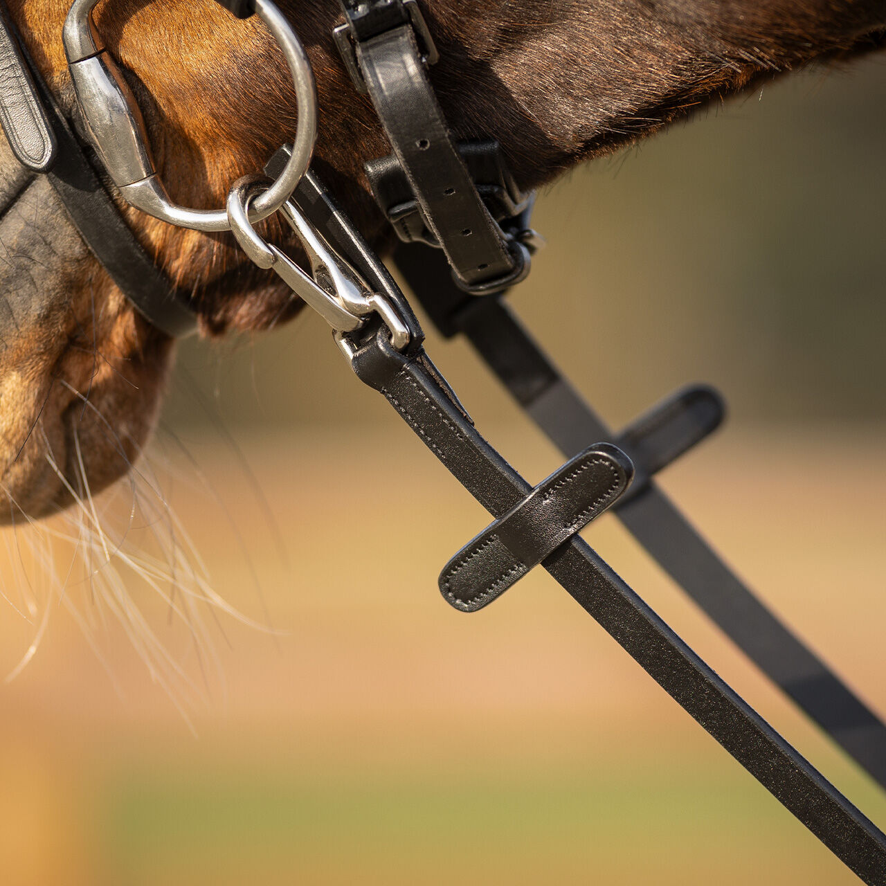 De QHP Teugel Eenzijdig Anti-Slip is voorzien van een rubberen doorweving voor extra grip en handige clips voor eenvoudig bevestigen en losmaken. Afgewerkt met leer en uitgerust met martingaalstoppers en zilverkleurige RVS-gespen.