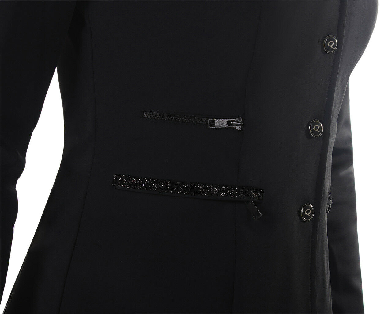 Straal tijdens elke wedstrijd met de QHP Wedstrijdjas Juliet. Deze elegante jas is gemaakt van ademende 4-way stretch stof en is waterafstotend voor extra comfort in het zadel. Het jasje heeft een verborgen ritssluiting achter de knoopsluiting, glittertape op de ritszakken en een zwart faux ritszakje voor een stijlvolle finishing touch.