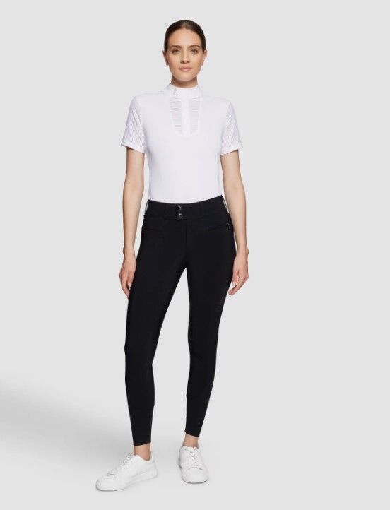 Samshield Clara Rijbroek – Elegantie, Comfort & Prestaties in EénDe Samshield Clara rijbroek is ontworpen voor amazones die houden van een elegante look en het comfort van een tweede-huid-effect. Met verfijnde Swarovski-details, technische stoffen en een flatterende pasvorm is deze rijbroek dé perfecte mix van stijl en functionaliteit.?? Luxe details met Swarovski kristallenVoorzien van een kristallen Samshield-logo en een subtiele blazoen-outline op de broekspijp – voor een stijlvolle, vrouwelijke uitstraling met een vleugje sparkle.- Tweede-huid pasvorm met compressiestofDe hoogwaardige technische stof voelt aan als een tweede huid, met extra compressie rond de kuiten voor betere doorbloeding en comfort tijdens het rijden.- Silicone grip voor ultieme stabiliteitMet duurzame silicone zitvlakgrip (of kniegrip, afhankelijk van variant) voor extra stevigheid en balans in het zadel.- Stijlvolle én praktische afwerkingVoorzien van ritszakken aan de voorzijde, dubbele achterzakken en een elegante, minimalistische afwerking – perfect voor zowel training als wedstrijd.- Onderhoudsvriendelijk & duurzaamDe anti-pilling stof is kreukvrij, waterafstotend en machinewasbaar – ideaal voor dagelijks gebruik.- UPF 50+ beschermingOptimale bescherming tegen schadelijke UV-straling op zonnige dagen – perfect voor outdoor ritten.Waarom kiezen voor de Clara rijbroek van Samshield?- Tweede-huid pasvorm met compressiestof- Swarovski details & elegant design- Silicone grip voor extra stabiliteit- Ademend, waterafstotend en kreukvrij- UPF 50+ zonbeschermingBestel nu jouw Clara rijbroek en combineer technische performance met verfijnde stijl – elke dag opnieuw.