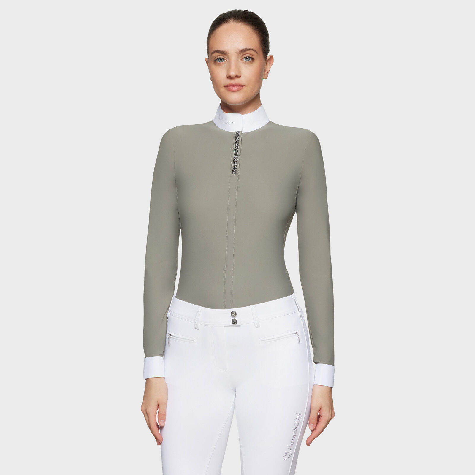 De Samshield Jella Premium wedstrijdtop met lange mouwen is speciaal ontworpen voor amazones die een sobere maar elegante stijl willen in de wedstrijdring. Met verfijnde kristaldetails en technische stoffen is deze top de perfecte combinatie van luxe en performance.